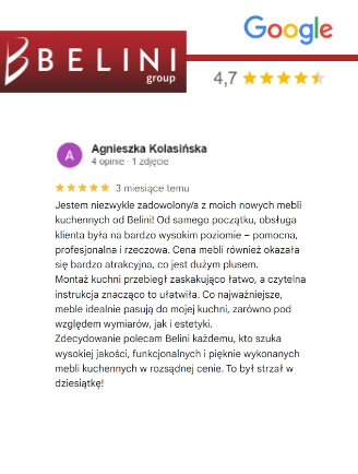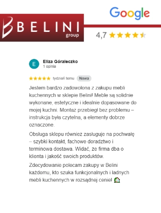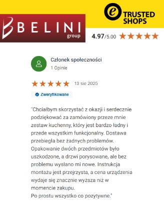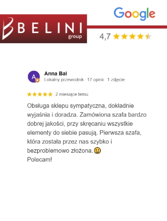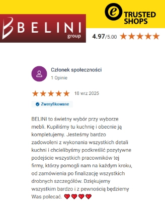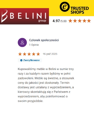 Cieszymy się najlepszym ratingiem branżowym w Europie. Belini uczestniczy w systemach scoringowych prowadzonych przez najbardziej wiarygodne instytucje zajmujące się oceną firm sprzedających w internecie, takich jak: Trusted Shops, Google, Heureka oraz Arukareso. Setki tysięcy pozytywnych opinii potwierdzają, że Belini to producent najlepszych mebli w Europie – mebli, które zachwycają wyglądem, trwałością i funkcjonalnością.