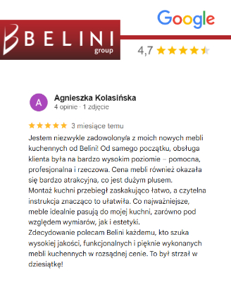 Cieszymy się najlepszym ratingiem branżowym w Europie. Belini uczestniczy w systemach scoringowych prowadzonych przez najbardziej wiarygodne instytucje zajmujące się oceną firm sprzedających w internecie, takich jak: Trusted Shops, Google, Heureka oraz Arukareso. Setki tysięcy pozytywnych opinii potwierdzają, że Belini to producent najlepszych mebli w Europie – mebli, które zachwycają wyglądem, trwałością i funkcjonalnością.